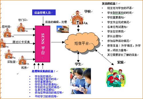 從上圖可以看到,在建立了SUNS校園綜合管理短信平臺以后,學(xué)生在校的活動可以通過信息采集系統(tǒng)收集,在進(jìn)行后臺信息處理的同時,建立一個與學(xué)生家庭直接溝通渠道。