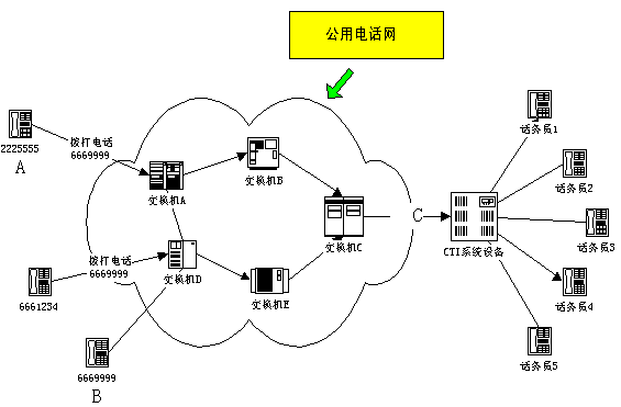 在傳統(tǒng)的CTI語音系統(tǒng)中,CTI運營商為企業(yè)提供的服務號碼是由CTI運營商向電信局申請的特服號碼加后綴組成。例如99001+12345,其中"99001"是運營商的特服號碼,后綴"12345"是企業(yè)的號碼,那么,一般客戶通過電話查詢企業(yè)的信息,需要進行兩次撥號,先撥通"99001",聽到提示音再按系統(tǒng)提示撥"12345",才能進入該企業(yè)的信息查詢界面。傳統(tǒng)方式存在以下缺點: