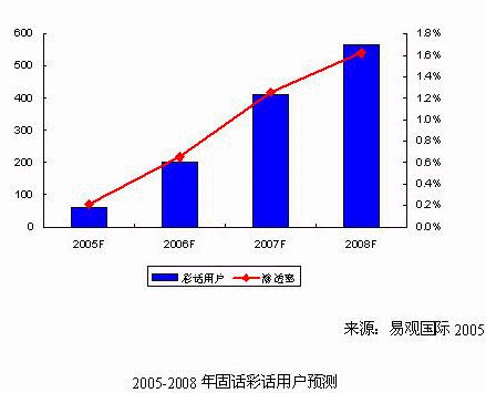 《固網(wǎng)增值業(yè)務(wù)研究系列報告-彩鈴彩話2005》中易觀國際認(rèn)為,固話彩話業(yè)務(wù)將難以像小靈通彩鈴那樣得到廣泛的應(yīng)用,但是能夠在細(xì)分市場中滿足固話用戶的個性化需求。易觀國際預(yù)測,2005年國內(nèi)固話彩話用戶總數(shù)將達(dá)到60萬戶,市場規(guī)模為1,000萬元人民幣;到2008年,固話彩話用戶超過550萬戶,市場規(guī)模將超過1.7億元人民幣。