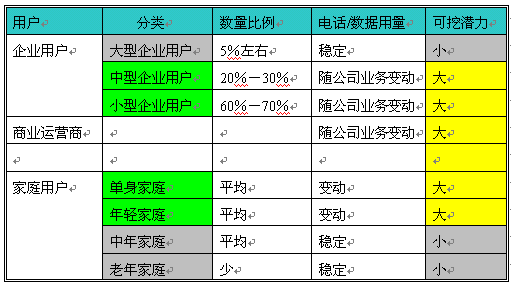 從以上表格可以清楚的顯示中小企業(yè)、商業(yè)運營商、年青用戶對電話和數(shù)據(jù)的使用不穩(wěn)定,這就意味者可發(fā)展、擴大使用的可能性非常大,是企業(yè)增加收入的潛在用戶,但最主要的是如何提高這些用戶的使用呢?經(jīng)濟規(guī)律告訴我們?nèi)绻闾峁┑纳唐穼τ脩粲杏,同時價廉、物美,用戶是不會拒絕的。對于電話運營商來講就是提供給企業(yè)帶來方便、效率、節(jié)省成本、方便管理的服務(wù)的同時,提高有效接通率。