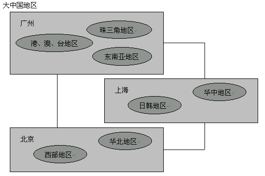 建設單點外包呼叫中心需要具備良好的地域服務功能,并應該是政治、商業(yè)中心,有較強的服務需求,例如:長江三角洲的服務可選擇上海建設第一個基點中心,珠江三角洲可選擇廣州為第一基點中心,華北可選擇北京為第一基點中心。如下圖示意: