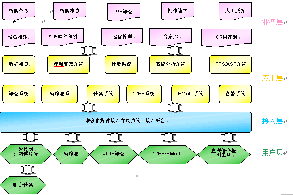 中心系統(tǒng)具備網(wǎng)絡呼叫中心及靈活的設備組網(wǎng)方式,必須使用多種媒體結(jié)合技術,平臺能智能處理來自不同媒體的服務請求。多媒體包含了固定電話、移動電話、傳真、尋呼、短消息、Web、Email、視頻、PDA等多媒體。