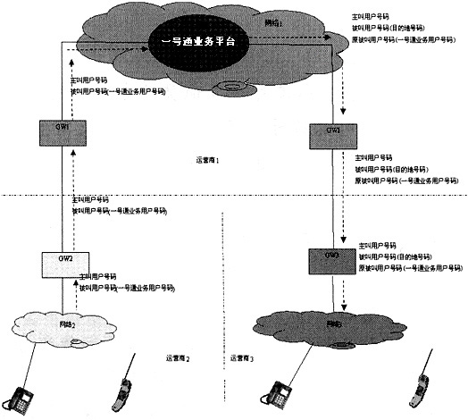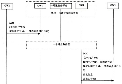 在圖1中,運營商2的用戶撥叫運營商1的一號通業(yè)務用戶號碼時,呼叫將通過運營商2的網(wǎng)關(guān)(GW2)、運營商1的網(wǎng)關(guān)(GW1)接續(xù)到運營商1的一號通業(yè)務平臺中。一號通業(yè)務平臺根據(jù)一號通業(yè)務用戶設置的接續(xù)規(guī)則,將呼叫翻譯到指定的目的地號碼。目的地號碼可能是運營商1的用戶,也可能是其他運營商的用戶。