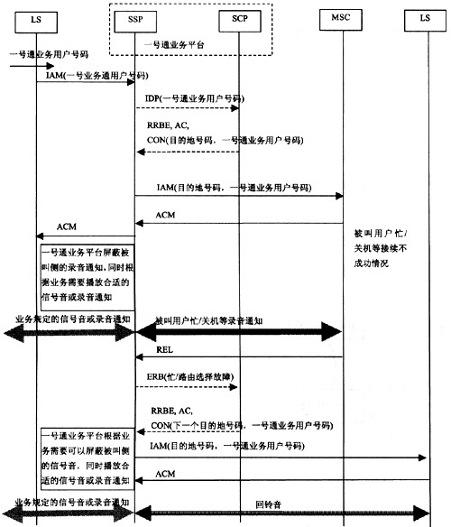 基于目前現(xiàn)網(wǎng)的信令處理方式,當一號通業(yè)務用戶所設定的目的地號碼為移動用戶時,如果出現(xiàn)被叫用戶忙、關(guān)機等接續(xù)不成功情況,現(xiàn)有的移動交換機會給主叫用戶播放錄音通知,通知用戶,如果主叫用戶不掛機,則在通知播放完畢后向前端交換機后向返回REL消息,釋放呼叫。一號通業(yè)務平臺收到釋放消息后根據(jù)業(yè)務需要,進行下次接續(xù)。如果按照原有的信令流程,主叫用戶會先聽到被叫用戶忙或關(guān)機的錄音通知,然后又聽到下一個呼叫的回鈴音。為了避免出現(xiàn)這種現(xiàn)象,一號通業(yè)務平臺要能夠屏蔽被叫側(cè)播放的錄音通知和信號音,并根據(jù)業(yè)務需要向主叫用戶播放合適的信號音或錄音通知,具體的屏蔽方式由一號通平臺自行確定。以智能網(wǎng)實現(xiàn)、ISUP消息為例,具體的消息流程如圖3所示。