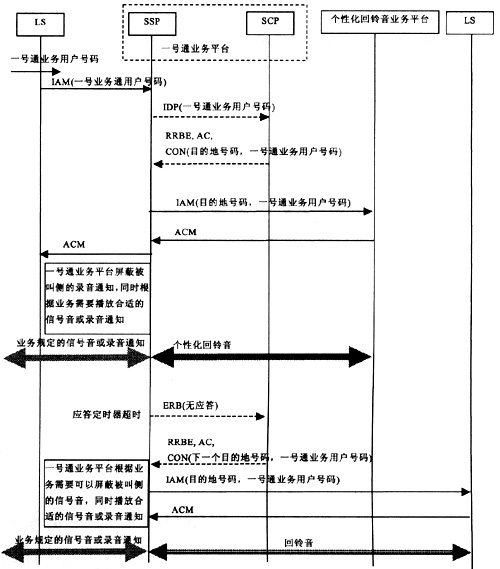 按照圖3所示的信令方式,一號通業(yè)務平臺屏蔽被叫側(cè)錄音通知后,如果被叫用戶申請了個性化回鈴音業(yè)務,則會產(chǎn)生一號通業(yè)務與個性化回鈴音業(yè)務之間的互斥性,即如果一號通業(yè)務用戶所設定的目的地號碼申請了個性化回鈴音業(yè)務,個性化回鈴音業(yè)務平臺給主叫用戶播放的錄音通知會被一號通業(yè)務平臺所屏蔽,主叫用戶將聽到由一號通業(yè)務平臺統(tǒng)一播放的信號音或錄音通知,而聽不到個性化回鈴音。以智能網(wǎng)實現(xiàn)、ISUP消息為例,具體的消息流程如圖4所示。
