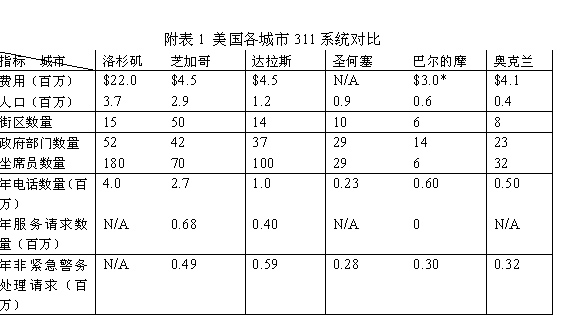 附表1是美國部門城市311系統(tǒng)建設(shè)運營的相關(guān)數(shù)據(jù)(為2002年數(shù)據(jù)),從表中可以看出美國311的一些基本情況。