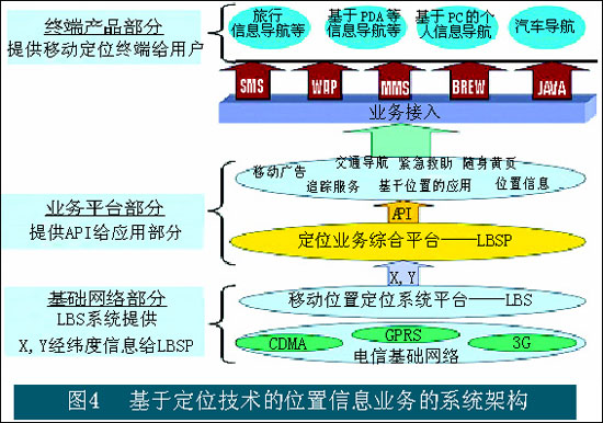 其中在基礎(chǔ)網(wǎng)絡(luò)層面中,LBS系統(tǒng)提供X、Y經(jīng)緯度信息,并把信息傳遞到定位業(yè)務(wù)綜合平臺(tái)。提供不同位置應(yīng)用的平臺(tái)部分通過(guò)接口的方式獲取位置信息,進(jìn)行面向特定業(yè)務(wù)的計(jì)算。終端用戶通過(guò)移動(dòng)終端并以不同的接入方式獲取位置類的信息服務(wù)。