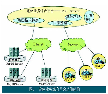 在上述結(jié)構(gòu)中,定位業(yè)務(wù)綜合平臺(tái)LBSP扮演著重要角色。其功能結(jié)構(gòu)如圖5所示。在該平臺(tái)中提供位置類信息業(yè)務(wù)的業(yè)務(wù)運(yùn)營(yíng)支撐功能,包括計(jì)費(fèi)功能(以及和BOSS系統(tǒng)的接口);同時(shí)該平臺(tái)還扮演著接入不同內(nèi)容開發(fā)商的重要角色。不同的內(nèi)容開發(fā)和提供商通過(guò)該平臺(tái)向最終用戶提供具體的業(yè)務(wù)和應(yīng)用,運(yùn)營(yíng)商通過(guò)該平臺(tái)對(duì)不同內(nèi)容開發(fā)商提供的內(nèi)容進(jìn)行管理和整理,使面向用戶的應(yīng)用能夠順利得到展現(xiàn)。該平臺(tái)提供的另一個(gè)重要角色是肩負(fù)著接入地圖信息提供商的重任,并在該平臺(tái)中通過(guò)地圖格式的轉(zhuǎn)換使不同地圖提供商所提供的地圖信息能夠以一致的格式向用戶提供。