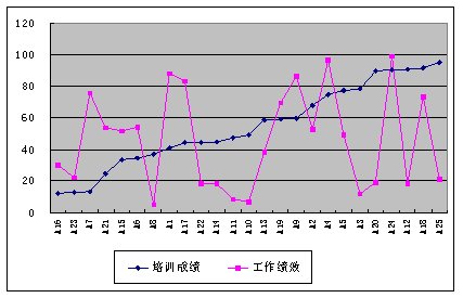 我們通過分析,圖3顯示,員工的培訓(xùn)成績和其工作績效是無關(guān)的,這說明培訓(xùn)是無效的。無效的原因也許是由于培訓(xùn)內(nèi)容不合理或培訓(xùn)組織實施不善等原因,總之培訓(xùn)是無效的,需要改進。