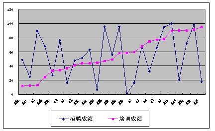 相反,如果培訓(xùn)成績和工作績效的關(guān)系如圖5,從中我們可以看出,培訓(xùn)的成績和招聘的成績表現(xiàn)出很強的正相關(guān),說明培訓(xùn)成績好的人,其工作績效相應(yīng)好,培訓(xùn)成績差的人,其工作績效也差,說明培訓(xùn)是有效的。