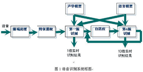 圖1所示為當(dāng)前大多數(shù)語音識(shí)別系統(tǒng)采用的框架和流程。原始語音經(jīng)前端處理后,從中提取出若干維的特征向量用于識(shí)別。識(shí)別時(shí),聲學(xué)模型和語言模型共同作用,得到使某一概率最大的字串作為識(shí)別結(jié)果。