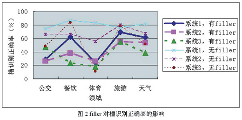 對(duì)于電話連續(xù)語音識(shí)別來說,由于錄制環(huán)境是辦公室真實(shí)環(huán)境,因此噪音并不是影響性能的主要因素。電話連續(xù)語音識(shí)別分為5個(gè)子領(lǐng)域,每個(gè)子領(lǐng)域各有一套語法。評(píng)測句子由語法生成的有效成分在前后加上任意長的填充詞(filler)構(gòu)成,如語法生成的句子為“從天安門到中關(guān)村怎么坐公交車”,而實(shí)際錄制的句子是“你好,請(qǐng)問從天安門到中關(guān)村怎么坐公交車,可以查到嗎?”,其中的“你好,請(qǐng)問”和“可以查到嗎”就是filler。由分析可以發(fā)現(xiàn),不同領(lǐng)域內(nèi)的槽識(shí)別正確率相差很大。這主要有兩個(gè)原因,一是不同領(lǐng)域的語法復(fù)雜度不同,二是不同領(lǐng)域內(nèi)有filler的句子所占比例不同。為了進(jìn)一步衡量filler對(duì)識(shí)別的影響,選取三個(gè)識(shí)別系統(tǒng),將有filler的句子和沒有filler的句子分別計(jì)算識(shí)別率,統(tǒng)計(jì)結(jié)果如圖2所示。從圖中可以看出,filler對(duì)識(shí)別的影響是相當(dāng)大的,無filler的句子比有filler的句子識(shí)別正確率可以高幾十個(gè)百分點(diǎn)。