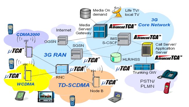 3G網絡中占主要地位的三個無線接入標準是WCDMA、TD-SCDMA與CDMA2000。3GPP與業(yè)界廠商對網絡結構的標準化做出的杰出努力,為在世界范圍內成功布署3G網絡業(yè)務起到了至關重要的作用。不過,3G網絡是復雜的系統(tǒng),包含有多種多樣的網元設備,AdvancedTCA與MicroTCA技術的出現把它的實現方式引向了標準化的道路,即通過商用組件快速、低成本地布署3G網絡,減少了各種獨立的實現方式的復雜性,提高了互操作性。