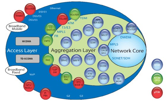 在匯聚層與核心網,對高可用性、傳輸容量與事務處理能力要求很高。ATCA通常是高性能的最佳選擇。mTCA與ATCA可對電信網中要求的操作性與高可用性提供與生俱來的支撐,而其它IT技術卻做不到。ATCA與mTCA作為一種系統(tǒng)技術,是電信級業(yè)務與商用組件之間自然而然的選擇。