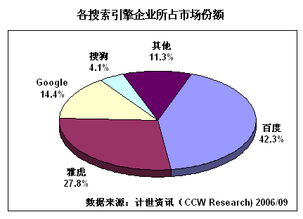 互聯(lián)網(wǎng)上的信息浩如煙海,是典型的信息爆炸,因此絕大多數(shù)網(wǎng)民都必須依靠搜索引擎才能找到所需信息,這個(gè)龐大的需求也就注定了搜索引擎市場(chǎng)的興旺繁榮。計(jì)世資訊(CCW Research)數(shù)據(jù)顯示:2004年中國的搜索引擎市場(chǎng)銷售總額達(dá)到9.4億元人民幣,增長67.9%,2005年繼續(xù)保持47.9%的增長速度,達(dá)到13.9億元,到2006年預(yù)計(jì)這個(gè)數(shù)字將突破20億元大關(guān)。