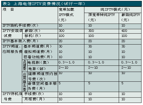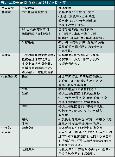 上海電信是國(guó)內(nèi)關(guān)注并切入IPTV業(yè)務(wù)較早的電信運(yùn)營(yíng)商之一,自2005年就開始積極測(cè)試和試驗(yàn)。此次上海電信在全上海市范圍內(nèi)推出IPTV業(yè)務(wù),被業(yè)界看作是“中國(guó)IPTV規(guī)模商用的新紀(jì)元”。除了影視節(jié)目收看、視頻內(nèi)容點(diǎn)播、時(shí)移功能外,上海電信的IPTV服務(wù)還包括時(shí)事新聞、遠(yuǎn)程醫(yī)療、視頻房產(chǎn)信息、餐飲信息、天氣預(yù)報(bào)、票務(wù)查詢等信息服務(wù)以及可視電話、IPTV游戲等個(gè)性化應(yīng)用。其中IPTV的直播頻道有58個(gè),視頻點(diǎn)播可選節(jié)目量達(dá)3000小時(shí)以上。另外,上海電信還推出了影像空間和電視大黃頁(yè)等應(yīng)用服務(wù),攝像愛(ài)好者可以利用“影像空間”應(yīng)用平臺(tái)上傳自己的視頻作品,然后通過(guò)IPTV機(jī)頂盒在自家的電視上欣賞自己的得意之作,并可以與已安裝IPTV的親朋好友一起分享;電視大黃頁(yè)可實(shí)現(xiàn)對(duì)各類行業(yè)、企事業(yè)單位信息資訊的搜索查詢。