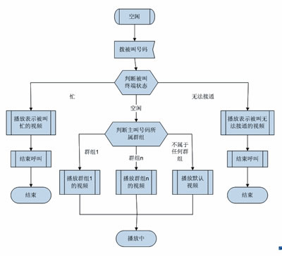 多媒體彩鈴用戶可以為某一位或某一組主叫用戶設(shè)定不同的視頻,當(dāng)某個(gè)主叫用戶來電時(shí),系統(tǒng)根據(jù)被叫用戶的狀態(tài)和主叫所屬的群組播放不同的視頻。如果被叫忙或者無法接通,則播放能表達(dá)被叫當(dāng)前狀態(tài)的默認(rèn)系統(tǒng)視頻;如果被叫空閑,則根據(jù)主叫號碼所屬的群組播放被叫為該群組定制的視頻。無論在哪種情況下,主叫都可以在手機(jī)上欣賞到精彩的視頻媒體。圖1是多媒體彩鈴業(yè)務(wù)使用流程。
