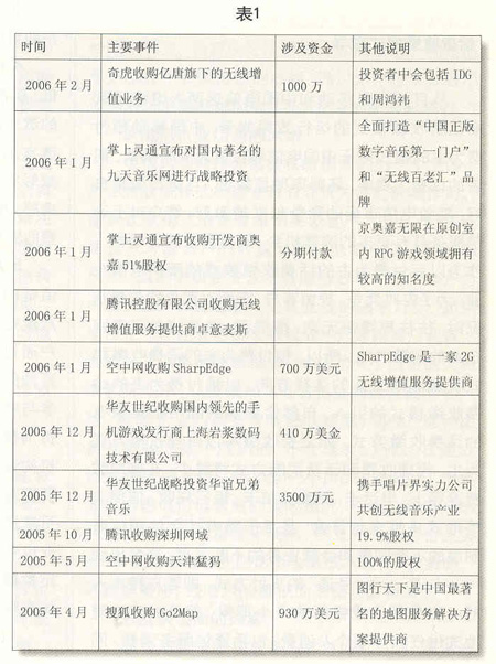 從2003年開(kāi)始,國(guó)內(nèi)就顯現(xiàn)出并購(gòu)增值服務(wù)運(yùn)營(yíng)企業(yè)的苗頭。2004年以來(lái),隨著整治增值服務(wù)運(yùn)營(yíng)企業(yè)的力度不斷加大,并購(gòu)漸成風(fēng)潮(見(jiàn)表1)。2004年2月,新浪收購(gòu)深圳網(wǎng)興科技公司;2004年5月,搜狐收購(gòu)手機(jī)WAP服務(wù)提供商北京吉菲爾公司。2005年,在“超級(jí)女生”節(jié)目大獲成功后,掌上靈通宣布將對(duì)國(guó)內(nèi)著名的九天音樂(lè)網(wǎng)進(jìn)行戰(zhàn)略投資,全面打造“中國(guó)正版數(shù)字音樂(lè)第一門(mén)戶(hù)”和“無(wú)線百老匯”品牌。各大移動(dòng)增值業(yè)務(wù)服務(wù)商通過(guò)并購(gòu)競(jìng)爭(zhēng)對(duì)手,門(mén)戶(hù)網(wǎng)站可以在移動(dòng)增值服務(wù)領(lǐng)域?qū)で笮碌耐黄,獲得可觀的利益,增強(qiáng)自身的競(jìng)爭(zhēng)力。伴隨著3G商用的日益臨近和市場(chǎng)競(jìng)爭(zhēng)的不斷加劇,主流SP(服務(wù)提供商)進(jìn)一步加快了資本購(gòu)并和業(yè)務(wù)整合的步伐,整個(gè)SP行業(yè)將加速洗牌。經(jīng)過(guò)市場(chǎng)整合,主流SP將不斷做大做強(qiáng),而相當(dāng)多的缺乏市場(chǎng)競(jìng)爭(zhēng)力的SP將被淘汰出局。