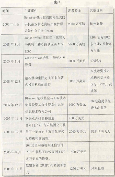 近幾年來(lái),一些資本投資商將投資的重點(diǎn)放到了無(wú)線音樂(lè)、手機(jī)游戲和手機(jī)視訊等業(yè)務(wù)領(lǐng)域,逐步加大了對(duì)SP的投資力度(見(jiàn)表3)。進(jìn)入2005年以來(lái),著眼于2.5G向3G的全面演進(jìn),風(fēng)險(xiǎn)投資對(duì)SP的投資力度進(jìn)一步加大。以滾石移動(dòng)為例,在2002年和2004年獲得兩輪風(fēng)險(xiǎn)投資之后,滾石移動(dòng)憑借在無(wú)線音樂(lè)領(lǐng)域取得的良好市場(chǎng)業(yè)績(jī),又獲得了智基創(chuàng)投、華登國(guó)際、聯(lián)想投資等公司的投資,投資金額達(dá)3000萬(wàn)美元。繼2004年10月獲得IDG投資以后,2005年12月7日,國(guó)內(nèi)著名的數(shù)字音樂(lè)門(mén)戶(hù)——A8音樂(lè)集團(tuán)獲得了包括IDG和Intel投資公司在內(nèi)的5家國(guó)際著名投資機(jī)構(gòu)的投資,投資金額達(dá)2000萬(wàn)美元。同月,掌中無(wú)限則獲得了來(lái)自全球性風(fēng)險(xiǎn)投資商BlueRun創(chuàng)投基金和IDG總額達(dá)上千萬(wàn)美元的投資。