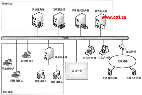 圖中管理中心和監(jiān)控前端、監(jiān)控中心是視頻監(jiān)控系統(tǒng)的組成部分,無線網(wǎng)絡部分則是視頻監(jiān)控和其他系統(tǒng)互通的一個示例。當然視頻監(jiān)控系統(tǒng)和其他業(yè)務網(wǎng)絡共同使用時,也可能會融為一體。