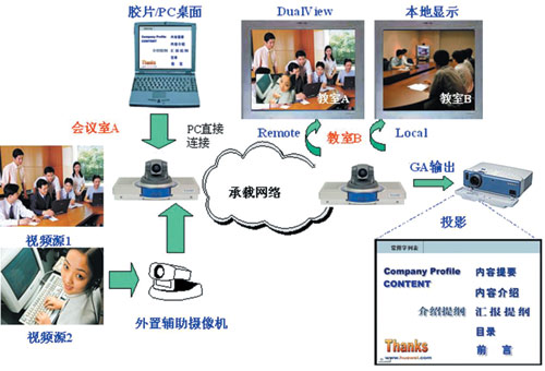 會議中常常需要同時傳送演講人的演講膠片和演講人的圖像,這套視訊系統(tǒng)非常方便地支持此功能,只需要把演講人的便攜機(jī)用線纜接到會場的終端上,通過終端的SXGA輸入功能可方便地將膠片信息發(fā)送到遠(yuǎn)端會場,遠(yuǎn)端會場通過終端的SXGA輸出接口將膠片內(nèi)容通過投影設(shè)備顯示出來,而終端的主視頻輸出接口顯示的是遠(yuǎn)端演講人的圖像。