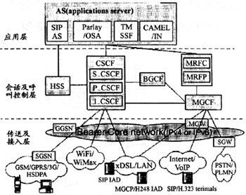 一般IMS分為三層,應(yīng)用層支持各類應(yīng)用服務(wù)器,負(fù)責(zé)為用戶提供增值業(yè)務(wù)和第三方業(yè)務(wù)。會(huì)話及呼叫控制層負(fù)責(zé)管理呼叫或會(huì)話設(shè)置,其中呼叫會(huì)話控制模塊CSCF完成呼叫網(wǎng)關(guān)功能、呼叫業(yè)務(wù)觸發(fā)功能和路由選擇功能,將SIP信令消息正確地轉(zhuǎn)發(fā)到應(yīng)用服務(wù)器。歸屬用戶服務(wù)器HSS用于維護(hù)每個(gè)終端用戶獨(dú)有的業(yè)務(wù)屬性,包括IP地址、漫游信息、好友列表、呼叫業(yè)務(wù)定制信息及語(yǔ)音郵件設(shè)置等。HSS是全網(wǎng)可用資源。媒體資源功能MRF包括MRFP和MRFC,負(fù)責(zé)提供及控制媒體流資源,如播放通知音、媒體流的混合、編解碼等。媒體網(wǎng)關(guān)控制MGCF負(fù)責(zé)PSTN承載與IP流之間的連接,根據(jù)被叫號(hào)碼和來話情況選擇CSCF,并完成PSTN與IMS之間的呼叫控制協(xié)議轉(zhuǎn)換,如將從CSCF接收到的SIP消息轉(zhuǎn)換為MEGACO或ISUP消息,并通過IP發(fā)送到信令網(wǎng)關(guān)SGW。出口網(wǎng)關(guān)控制功能BGCF主要實(shí)現(xiàn)呼叫路由功能,為呼叫選擇適當(dāng)?shù)腜STN接口點(diǎn),若發(fā)現(xiàn)該接口點(diǎn)與自己在同一網(wǎng)絡(luò),則選擇本網(wǎng)絡(luò)的MGCF與PSTN交互,若發(fā)現(xiàn)接口點(diǎn)在另一網(wǎng)絡(luò)時(shí),BGCF將會(huì)話信令轉(zhuǎn)發(fā)給另一網(wǎng)絡(luò)相應(yīng)的BGCF。一個(gè)IMS可以包含一個(gè)或多個(gè)CSCF、HSS、MGCF等功能模塊。傳送及接入層承載各種類型之間的轉(zhuǎn)換,完成與傳統(tǒng)PSTN/PLMN間的互通等功能,包括各類有線接入、無線接入、互聯(lián)互通網(wǎng)關(guān)等設(shè)備。
