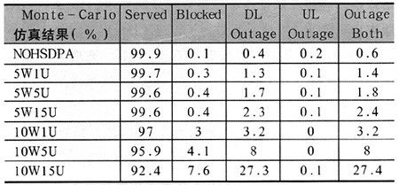 通過表3可以看出,隨著HSDPA功率分配的增加,網(wǎng)絡阻塞率和下行鏈路功率過載隨之增加,特別是功率增加到10W時,增加幅度尤為明顯;在一定的HSDPA功率分配前提下,隨著網(wǎng)內HSDPA用戶數(shù)的增加,網(wǎng)絡阻塞率和下行鏈路功率過載隨之增加,特別是用戶數(shù)增加到15人時,增加幅度尤為明顯。可見HSDPA網(wǎng)絡性能在一定程度上受限于HSDPA功率分配和網(wǎng)內HSDPA用戶數(shù)。