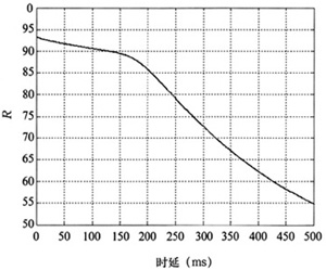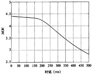 對實時的語音和視頻業(yè)務來說,業(yè)務數(shù)據(jù)端到端的時延最為關鍵,從仿真結果圖6和圖7可以看出時延對R系數(shù)和MOS值的影響:隨著時延的增加,R系數(shù)和MOS值都降低,即語音質量變差。當時延大于150ms時,語音質量下降的比較厲害。