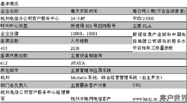 浙江省電信有限公司杭州市分公司客戶服務(wù)中心(以下簡(jiǎn)稱杭州電信客服中心,或者杭州電信10000號(hào))成立于2002年9月,是一個(gè)基于CTI技術(shù)、充分利用通信網(wǎng)和計(jì)算機(jī)網(wǎng)絡(luò)的綜合信息服務(wù)系統(tǒng),以電話為主,輔之以傳真、短信、Email、互聯(lián)網(wǎng)等多種接觸媒體,通過人工、自助語(yǔ)音與網(wǎng)上服務(wù)的方式,為杭州400萬(wàn)電信客戶提供綜合電信業(yè)務(wù)的咨詢、查詢、受理、投訴、報(bào)障和電話營(yíng)銷。建有2130路中繼通道,1410路自動(dòng)語(yǔ)音通道,186個(gè)人工服務(wù)座席、189個(gè)電話營(yíng)銷座席、80個(gè)外包座席,占地5600多平米,分別位于杭州市惠興路9號(hào)和慶春路133號(hào)。