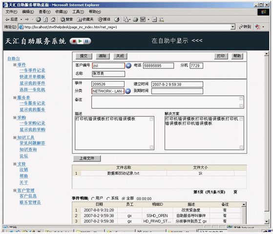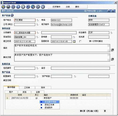 事件記錄應(yīng)該在某個(gè)服務(wù)臺(tái)工具中記錄和跟蹤,該工具最好是作為集成的服務(wù)管理工具集的構(gòu)成部分。該工具應(yīng)該在引發(fā)新的事件時(shí)提供最基本的事件記錄。比如為了幫助提高效率,當(dāng)你在天匯幫助臺(tái)的用于記錄事件的事件窗口中輸入請(qǐng)求發(fā)起者的姓名時(shí),利用客戶數(shù)據(jù)庫(kù)可以自動(dòng)填充諸如位置、部門(mén)和聯(lián)系詳細(xì)信息等字段。天匯幫助臺(tái)還支持使用計(jì)算機(jī)電話集成