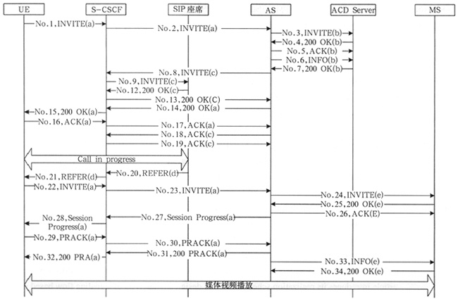 - No.33~34:AS根據(jù)用戶的相關(guān)信息去數(shù)據(jù)庫(kù)檢索所需媒體資源的文件名,并以INFO消息指示MS開(kāi)始播放多媒體視頻;MS以200響應(yīng)收到的INFO消息,根據(jù)INFO消息中攜帶的媒體文件名去資源服務(wù)器中獲取該資源,并播放該多媒體資源。