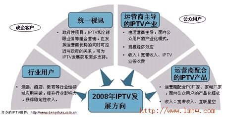 2008年,IPTV市場,因?yàn)榘l(fā)展速度明顯慢于了市場進(jìn)度和技術(shù)演進(jìn)。因此在原有的運(yùn)營商產(chǎn)業(yè)化推動(dòng)形勢下,終端廠家推動(dòng)下的產(chǎn)品化發(fā)展模式也會(huì)得到更大的發(fā)展空間,而這在一定程度上雖會(huì)推動(dòng)用戶對IPTV的認(rèn)知度,同時(shí)也會(huì)分化一部分IPTV產(chǎn)業(yè)化的動(dòng)力。
