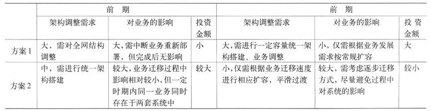 根據(jù)網(wǎng)絡(luò)演進(jìn)架構(gòu)清晰度、實(shí)施難度、投資金額等綜合因素考慮,對(duì)以上方案分析對(duì)比如表1所示。