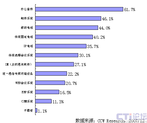 盡管統(tǒng)一通信的概念已經(jīng)被各大廠商廣為宣傳,統(tǒng)一通信的目標(biāo)是實(shí)現(xiàn)各種溝通方式的融合,但是從國內(nèi)的企業(yè)來看,他們對(duì)統(tǒng)一通信的認(rèn)識(shí)仍然還處于比較模糊的階段,那么從用戶本身來講,他們最需要統(tǒng)一通信能把哪些功能實(shí)現(xiàn)相互融合呢?2007年底,國內(nèi)ICT市場研究咨詢機(jī)構(gòu)計(jì)世資訊(CCW Research)對(duì)國內(nèi)的潛在用戶進(jìn)行了一次大樣本調(diào)研,被調(diào)研的企業(yè)數(shù)量超過800家,企業(yè)領(lǐng)域分布在各行各業(yè),重點(diǎn)以大中型企業(yè)為主,調(diào)研結(jié)果表明,目前國內(nèi)企業(yè)用戶希望能實(shí)現(xiàn)互聯(lián)互通功能排在第一位的是辦公套件、占到所有被調(diào)研對(duì)象的六成以上,其次是郵件系統(tǒng)和移動(dòng)電話,占近一半的比例,之后是固話、視頻會(huì)議和即時(shí)通信,而和用戶業(yè)務(wù)系統(tǒng)的整合,如ERP、CRM則排在最后。