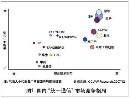 “統(tǒng)一通信”與傳統(tǒng)通信的根本區(qū)別在于不僅僅是網(wǎng)絡(luò)的融合,也是應(yīng)用的融合。從這個(gè)層面來(lái)看,“統(tǒng)一通信”真正帶給用戶的是成本的降低、工作效率的提升以及整個(gè)運(yùn)行機(jī)制的改變!敖y(tǒng)一通信”是以人性化為特征應(yīng)用層面的融合,這種融合囊括了更多的內(nèi)容、覆蓋更廣闊的領(lǐng)域、具有更大的力量,它使得通信產(chǎn)業(yè)與IT產(chǎn)業(yè),通信設(shè)備商、軟件廠商與電信運(yùn)營(yíng)商之間的邊界越來(lái)越模糊,跨行業(yè)、跨領(lǐng)域的聯(lián)盟與合作成為開(kāi)拓市場(chǎng)的必需。但隨著眾廠商的紛紛加入,多款“統(tǒng)一通信”產(chǎn)品及解決方案的推出,“統(tǒng)一通信”市場(chǎng)展現(xiàn)出了勃勃生機(jī)和巨大的成長(zhǎng)潛力。在這些廠商中,有市場(chǎng)調(diào)研數(shù)據(jù)顯示思科市場(chǎng)份額領(lǐng)先,市場(chǎng)占有率高達(dá)35%。各類廠商之間既有競(jìng)爭(zhēng)又有合作,但還沒(méi)有一個(gè)廠商占絕對(duì)優(yōu)勢(shì)。實(shí)際上,“統(tǒng)一通信”市場(chǎng)上的競(jìng)爭(zhēng)者并不僅僅是這幾家巨頭,眾多網(wǎng)絡(luò)工具廠商、商用電話廠商也參與了這一競(jìng)爭(zhēng)平臺(tái)。幾乎所有和ICT有關(guān)的巨頭廠商都集中在了這個(gè)領(lǐng)域,“統(tǒng)一通信”正進(jìn)入群雄爭(zhēng)霸的時(shí)代。國(guó)內(nèi)“統(tǒng)一通信”市場(chǎng)競(jìng)爭(zhēng)格局如圖1所示。