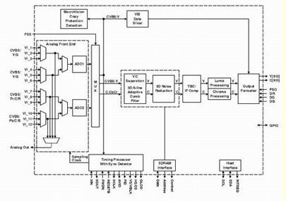 圖2所示為視頻解碼器的數(shù)據(jù)流路徑,它負(fù)責(zé)處理NTSC、PAL、SECAM、S-Video、SCART、YPbPr、RGB、480p和其它輸入格式。在數(shù)字電視中,對(duì)這種級(jí)別的靈活性的支持是必需的,完全是為了讓一個(gè)機(jī)型經(jīng)過(guò)實(shí)際設(shè)置可以工作于任何格式。數(shù)字電視解碼器的典型性能特征包括:同步、消隱、場(chǎng)、有源視頻窗口、水平和垂直同步、時(shí)鐘、同步鎖相(用于下行視頻編碼同步)、主CPU中斷和可編程邏輯I/O信號(hào)。這是對(duì)數(shù)字視頻輸出以及用于先進(jìn)的垂直消隱期(VBI)數(shù)據(jù)恢復(fù)的補(bǔ)充。作為一種附加功能,一些視頻解碼器支持VBI數(shù)據(jù)處理器(VDP)在文字電視廣播、傳送字幕(CC)和其它VBI數(shù)據(jù)上進(jìn)行數(shù)據(jù)分片、解析和執(zhí)行誤碼校驗(yàn)。內(nèi)置的FIFO存儲(chǔ)多達(dá)11行文字電視廣播數(shù)據(jù),而適當(dāng)?shù)闹鹘涌谕郊叭聊晃淖蛛娨晱V播恢復(fù)是當(dāng)今系統(tǒng)中的幾個(gè)常見要求。然而,一些實(shí)現(xiàn)方案需要一種解碼器,它能夠?yàn)榛谥鰿PU的VBI處理提供速度為已采樣原始亮度數(shù)據(jù)兩倍的輸出格式化數(shù)據(jù)。