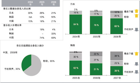 彩鈴在中國(guó)倍受青睞并且仍具發(fā)展?jié)摿,在日本和韓國(guó),手機(jī)鈴聲和整曲下載占據(jù)著手機(jī)音樂的主導(dǎo)地位,如圖3所示。