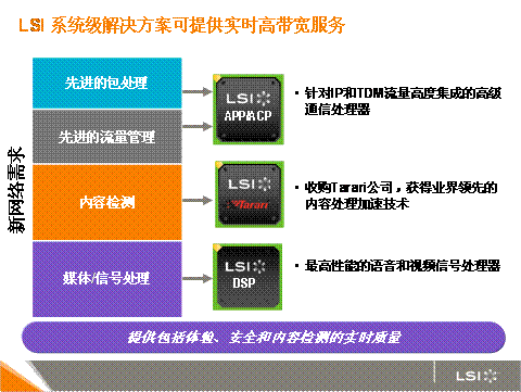 LSI的高級通信處理器可實現(xiàn)出色的服務質量、高等級與流量管理能力,對于通過基于數(shù)據(jù)包的網絡交付像實時視頻這樣的新服務與服務而言,這些技術至關重要。由于網絡對高帶寬的需求越來越大,一般的網絡處理器可擴展性跟不上網絡的發(fā)展步伐。然而,LSI 的 NPU 則能將數(shù)據(jù)和控制路徑分開,更加有效地交付媒體流,從而保證了實時可靠性和真正的線速性能。這樣移動用戶可以享受到卓越的視頻質量。