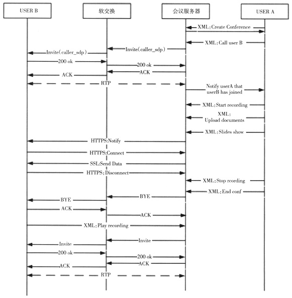 基于上述多媒體會議業(yè)務的實現(xiàn)流程,圖3給出了一個多媒體會議業(yè)務典型應用的信令流程,具體包括對于用戶創(chuàng)建會議、邀請與會成員、會議中的,文件演示、會議的錄制與會議的回放等信令流程的描述。