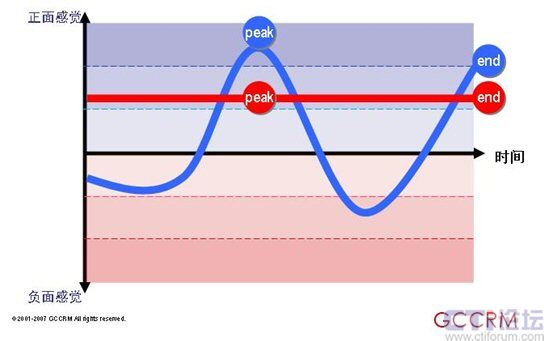 紅色情感曲線代表旨在提供全面理想體驗的傳統(tǒng)方法。藍(lán)色情感曲線反映的是一種資源分配的新方法,它專注于峰值和終了這兩個關(guān)鍵點同時將剩余子流程的表現(xiàn)控制在平均水平之下。看似效率較低的那個(藍(lán)色情感曲線)