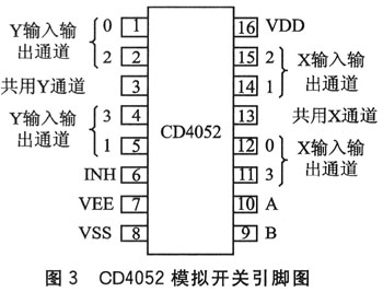 51系列單片機(jī)一般只有一個(gè)串行通路,通過串口與GSM模塊連接后,則不能再連接其他串口設(shè)備;而一些串口擴(kuò)展芯片成本較高,連接也較麻煩。本方法利用數(shù)控模擬開關(guān)CD4052來做多串口擴(kuò)展器,成本低廉而且接線簡單。其引腳排列如圖3所示。