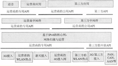 在某種意義上,下一代網(wǎng)絡(luò)必須是一種可編程的、基于IP的網(wǎng)絡(luò),這必然要求XG為應(yīng)用開(kāi)發(fā)提供強(qiáng)大的、方便的、定義明確的API。對(duì)于一些業(yè)務(wù)提供商來(lái)說(shuō),API思想本身并非僅僅是一個(gè)基本概念。目前,公共API是指所有第三方都可用的API,它包括標(biāo)準(zhǔn)的、開(kāi)放的API子集。另一方面,專用API是指由某個(gè)公司控制、僅僅在公司內(nèi)部或合作伙伴內(nèi)部可用的API。圖1給出了下一代網(wǎng)絡(luò)API體系結(jié)構(gòu)的一種高級(jí)分類方法。