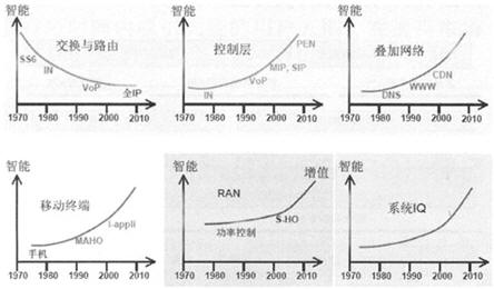 圖2描述了系統(tǒng)構(gòu)件的智能演進(jìn)情況。過(guò)去10年中,核心網(wǎng)中交換和路由功能實(shí)體的智能化程度在降低,20世紀(jì)70年代通用信道信令(CCS)的引入,智能網(wǎng)(IN)體系結(jié)構(gòu)的出現(xiàn)更是加劇了這種趨勢(shì)。在智能網(wǎng)體系結(jié)構(gòu)中,電信交換機(jī)的業(yè)務(wù)邏輯被去除,并將其移到分布式數(shù)據(jù)庫(kù)中。