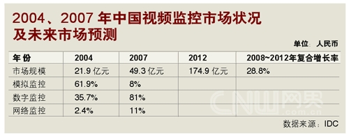IDC的數(shù)字同樣樂觀。跟據(jù)IDC在2008年的預(yù)測(cè),2008~2012年,中國(guó)視頻監(jiān)控市場(chǎng)的年均復(fù)合增長(zhǎng)率將達(dá)28.8%,遠(yuǎn)高于IT市場(chǎng)投入的平均增長(zhǎng)率。而在模擬、數(shù)字與IP模式(即網(wǎng)絡(luò)監(jiān)控)組成的視頻監(jiān)控市場(chǎng)里,IP的增長(zhǎng)率又將高于前二者,成為市場(chǎng)增長(zhǎng)的強(qiáng)勁動(dòng)力。”(注:模擬監(jiān)控是指圖像信號(hào)在采集后,通過模擬信號(hào)傳輸?shù)姆忾]式視頻監(jiān)控系統(tǒng)模式;數(shù)字監(jiān)控是指圖像信號(hào)在采集后,經(jīng)過編碼轉(zhuǎn)化成數(shù)字信號(hào)再進(jìn)行傳輸?shù)姆忾]或半封閉式視頻監(jiān)控系統(tǒng)模式;網(wǎng)絡(luò)監(jiān)控是指系統(tǒng)建立在以網(wǎng)絡(luò)為基礎(chǔ)的傳輸平臺(tái)的開放式視頻監(jiān)控系統(tǒng)模式)。