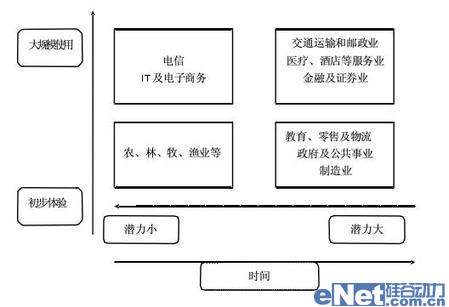 象限2--代表位于該象限的行業(yè)只是初步使用通信產(chǎn)品,并且該行業(yè)對(duì)通信產(chǎn)品需求不高,市場(chǎng)空間不大。該行業(yè)主要靠勞動(dòng)力和自然資源獲取利潤(rùn),一般現(xiàn)代化程度較低,對(duì)通信要求不高,供應(yīng)商利潤(rùn)不大。