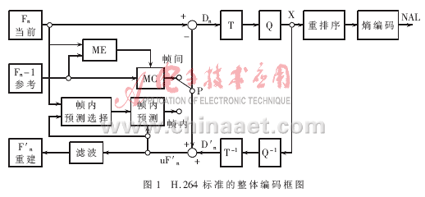 Abstraction Layer),負責(zé)對數(shù)據(jù)進行打包和傳送。H.264編碼圖像通常分為三種類型:I幀、P幀、B幀。I幀為幀內(nèi)編碼幀,其編碼不依賴于已編碼的圖像數(shù)據(jù)。P幀為前向預(yù)測幀,B幀為雙向預(yù)測幀,編碼時都需要根據(jù)參考幀進行運動估計。同時,H.264在提高圖像傳輸容錯性方面做了大量工作,重新定義了適于圖像的結(jié)構(gòu)劃分。在編碼時,圖像幀各部分被劃分到多個Slice結(jié)構(gòu)中,每個Slice都可以被獨立編碼,不受其他部分影響。Slice由圖像最基本的結(jié)構(gòu)——宏塊組成,每個宏塊包含一個16×16的亮度塊和兩個8×8的色度塊。H.264標準的整體編碼框圖如圖1所示。編碼過程中,原始數(shù)據(jù)進入編碼器后,當(dāng)采用幀內(nèi)編碼時,首先選擇相應(yīng)的幀內(nèi)預(yù)測模式進行幀內(nèi)預(yù)測,隨后對實際值和預(yù)測值之間的差值進行變換、量化和嫡編碼,同時編碼后的碼流經(jīng)過反量化和反變換之后重構(gòu)預(yù)測殘差圖像,再與預(yù)測值相加得出重構(gòu)幀,得出的結(jié)果經(jīng)過去塊濾波器平滑后送入幀存儲器。采用幀間編碼時,輸入的圖像塊首先在參考幀中進行運動估計,得到運動矢量。運動估計后的殘差圖像經(jīng)整數(shù)變換、量化和嫡編碼后與運動矢量一起送入信道傳輸。同時另一路碼流以相同的方式重構(gòu)后,經(jīng)去塊濾波后送入幀存儲器作為下一幀編碼的參考圖像。