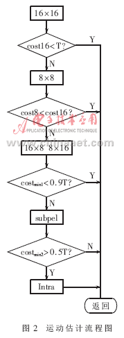 (4)算法替代和改進。幀間預(yù)測的改進:關(guān)于算法的改進主要集中在對me(motion estimation)的改進上,流程如圖2所示。costmin1=min(cost16,cost8,cost16×8,cost8×16),costmin2=min(costmin1,costsub),依次在16×16、8×8、16×8和8×16大小宏塊的整像素位置做預(yù)測,再做次像素估計和幀內(nèi)預(yù)測,選用匹配準則函數(shù)(采用sad作為匹配準則函數(shù))取得最小值的模式進行編碼。每計算一種模式,都將sad值與一個經(jīng)驗閥值做比較。當(dāng)sad值小于這個閥值時,立即結(jié)束運動估計,從而減少運算量。