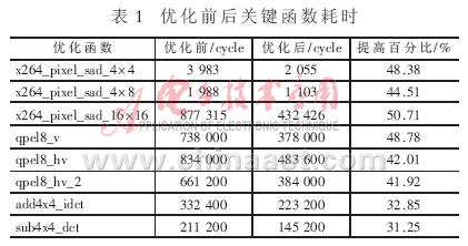 和SRAM 進行擴展,可以訪問多達132 MB的物理存儲器。根據(jù)這樣的特點,將執(zhí)行率更高的代碼放入L1指令緩存中,能使代碼更快地運行。IDE提供了Profile工具,能在運行時統(tǒng)計各個函數(shù)所占的CYCLE數(shù)和占總CYCLE數(shù)的百分比。通過將X264中比較耗時的部分算法代碼,如模式選擇部分代碼放入L1指令空間,能進一步提升運行效率。Profile工具統(tǒng)計結(jié)果同樣也是選擇需要使用匯編優(yōu)化函數(shù)的依據(jù),IDE可根據(jù)Profile結(jié)果對代碼進行優(yōu)化。X264代碼Profile統(tǒng)計結(jié)果與測試數(shù)據(jù)有很大關(guān)系,選用更類似以后應(yīng)用場所的數(shù)據(jù)作為測試數(shù)據(jù),能使統(tǒng)計結(jié)果更接近以后的應(yīng)用環(huán)境。為達到比較準確的統(tǒng)計結(jié)果,最好在Simulation階段進行統(tǒng)計。雖然這樣非常耗時,但為得到一個準確的統(tǒng)計作為參考依據(jù)是值得的。此外CACHE