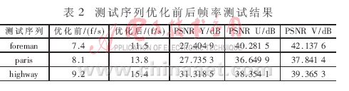 對三種測試序列在總線頻率120MHz下進行優(yōu)化前后幀率測試,結(jié)果如表2所示。從表2可以看出,采用以上優(yōu)化方法能顯著提高幀率。