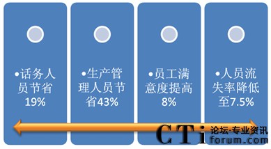 專席將復雜的、疑難的業(yè)務承擔起來,前臺員工平均通話時長由專席設置前的82秒壓縮到目前的67秒。由于通話時長的縮短,節(jié)省了大量人力資源,江蘇移動10086客服中心全年減少226名客戶代表人工成本和156個臺席成本,年節(jié)省人工成本591萬元和臺席投資費用611萬。